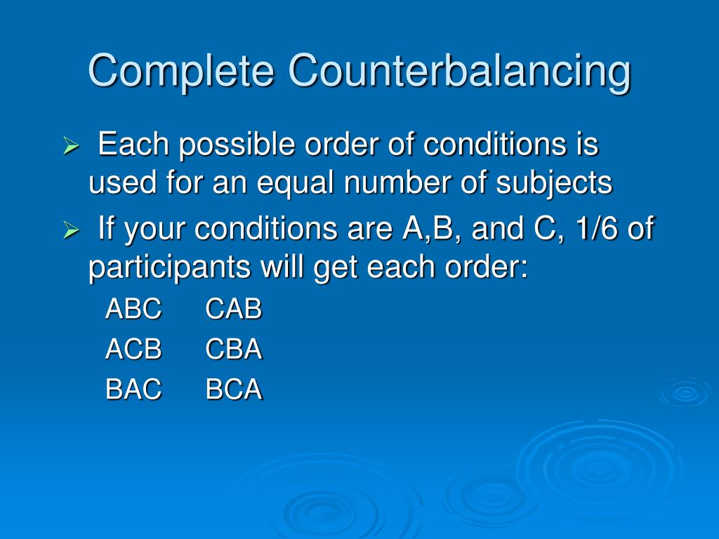 Complete Counterbalancing • Each possible order of conditions is used for an equal number of subjects • If your conditions are A,B, and C, 1/6 of participants will get each order: ABC CAB ACB CBA BAC BCA