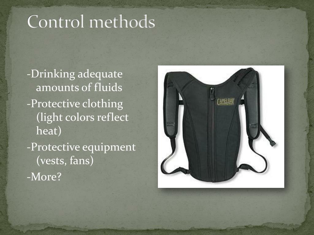 Control methods -Drinking adequate amounts of fluids -Protective clothing (light colors reflect heat) -Protective equipment (vests, fans) -More?