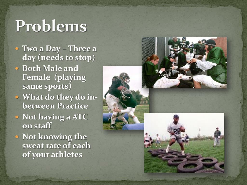 Problems • Two a Day – Three a day (needs to stop) • Both Male and Female (playing same sports) • What do they do in-between Practice • Not having a ATC on staff • Not knowing the sweat rate of each of your athletes