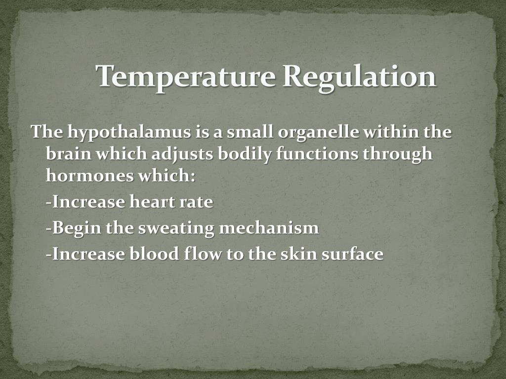Temperature Regulation The hypothalamus is a small organelle within the brain which adjusts bodily functions through hormones which: -Increase heart rate -Begin the sweating mechanism -Increase blood flow to the skin surface