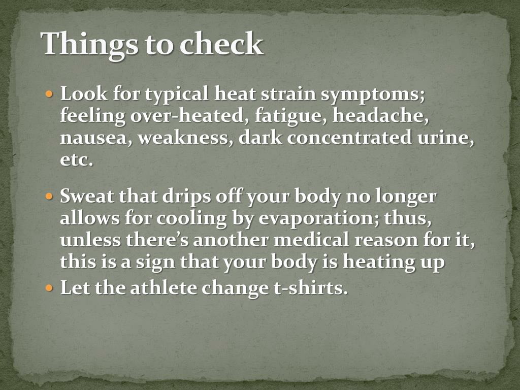 Things to check • Look for typical heat strain symptoms; feeling over-heated, fatigue, headache, nausea, weakness, dark concentrated urine, etc. • Sweat that drips off your body no longer allows for cooling by evaporation; thus, unless there’s another medical reason for it, this is a sign that your body is heating up • Let the athlete change t-shirts.