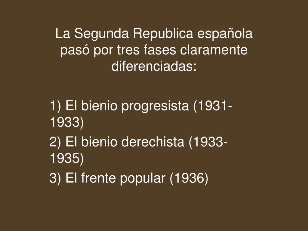 La Segunda Republica española pasó por tres fases claramente diferenciadas: 1) El bienio progresista (1931-1933) 2) El bienio derechista (1933-1935) 3) El frente popular (1936)