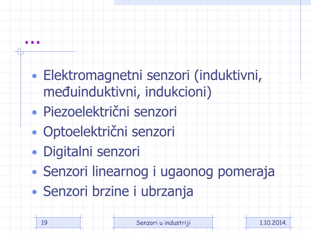 ... • Elektromagnetni senzori (induktivni, međuinduktivni, indukcioni) • Piezoelektrični senzori • Optoelektrični senzori • Digitalni senzori • Senzori linearnog i ugaonog pomeraja • Senzori brzine i ubrzanja Senzori u industriji