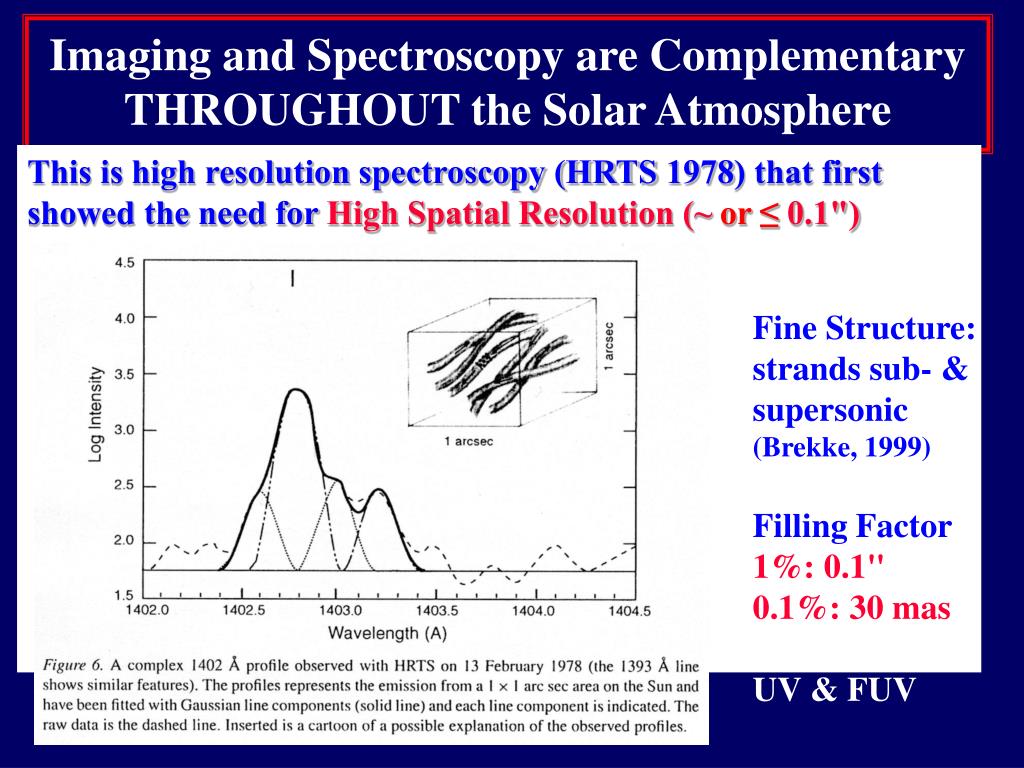 Imaging and Spectroscopy are Complementary THROUGHOUT the Solar Atmosphere This is high resolution spectroscopy (HRTS 1978) that first showed the need for High Spatial Resolution (~ or ≤ 0.1") Fine Structure: strands sub- &supersonic (Brekke, 1999) Filling Factor 1%: 0.1" 0.1%: 30 mas UV & FUV TRACE SOHO/SUMER