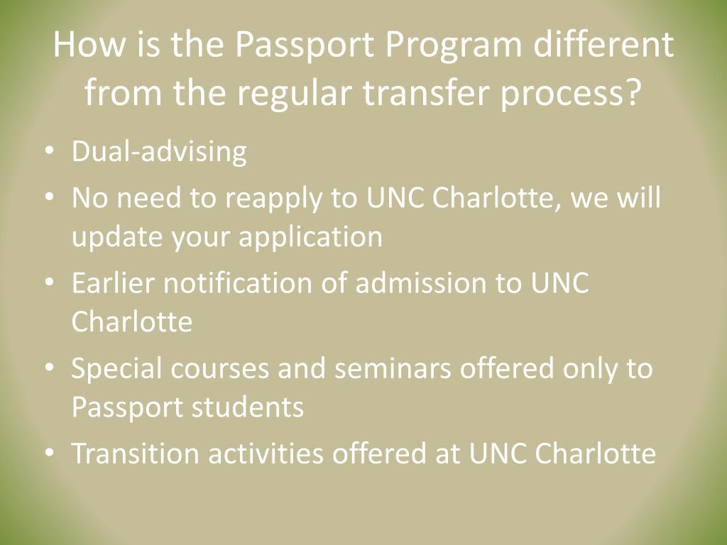 How is the Passport Program different from the regular transfer process? • Dual-advising • No need to reapply to UNC Charlotte, we will update your application • Earlier notification of admission to UNC Charlotte • Special courses and seminars offered only to Passport students • Transition activities offered at UNC Charlotte