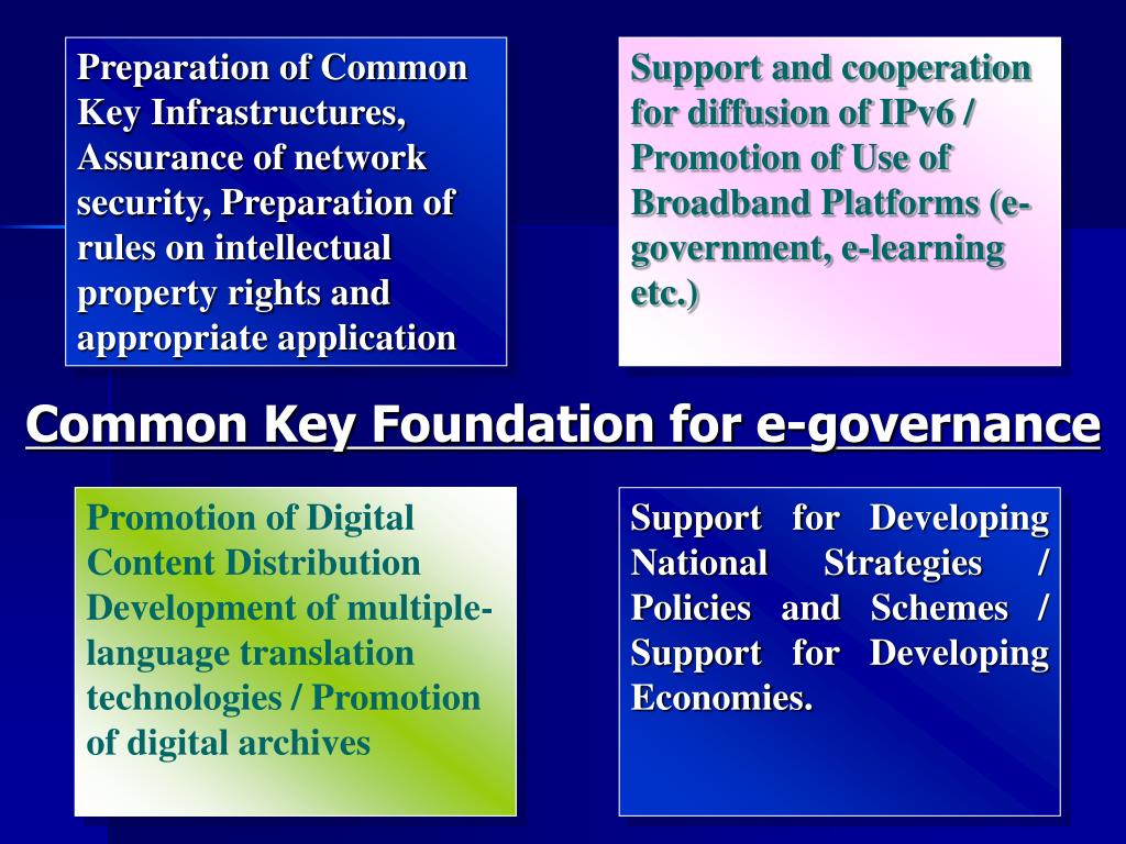 Preparation of Common Key Infrastructures, Assurance of network security, Preparation of rules on intellectual property rights and appropriate application Support and cooperation for diffusion of IPv6 / Promotion of Use of Broadband Platforms (e-government, e-learning etc.) Common Key Foundation for e-governance Promotion of Digital Content Distribution Development of multiple-language translation technologies / Promotion of digital archives Support for Developing National Strategies / Policies and Schemes / Support for Developing Economies.