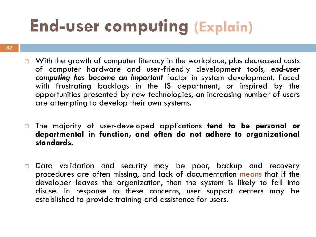 End-user computing (Explain) • With the growth of computer literacy in the workplace, plus decreased costs of computer hardware and user-friendly development tools, end-user computing has become an important factor in system development. Faced with frustrating backlogs in the IS department, or inspired by the opportunities presented by new technologies, an increasing number of users are attempting to develop their own systems. • The majority of user-developed applications tend to be personal or departmental in function, and often do not adhere to organizational standards. • Data validation and security may be poor, backup and recovery procedures are often missing, and lack of documentation means that if the developer leaves the organization, then the system is likely to fall into disuse. In response to these concerns, user support centers may be established to provide training and assistance for users.