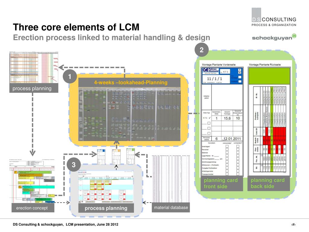 Three core elements of LCMErection process linked to material handling & design 2 1 4-weeks –lookahead-Planning process planning 3 planning card back side planning card front side material database process planning erection concept