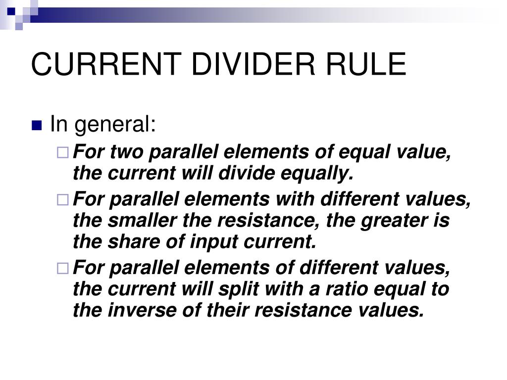 CURRENT DIVIDER RULE • In general: • For two parallel elements of equal value, the current will divide equally. • For parallel elements with different values, the smaller the resistance, the greater is the share of input current. • For parallel elements of different values, the current will split with a ratio equal to the inverse of their resistance values.