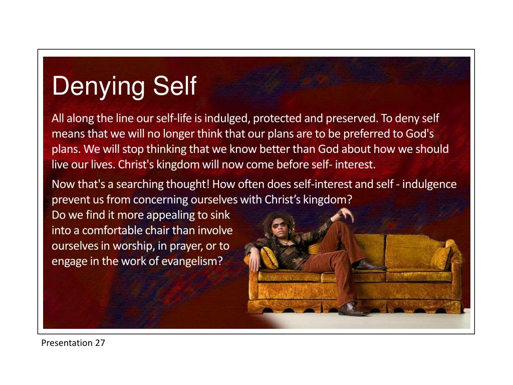 Denying Self All along the line our self-life is indulged, protected and preserved. To deny self means that we will no longer think that our plans are to be preferred to God's plans. We will stop thinking that we know better than God about how we should live our lives. Christ's kingdom will now come before self- interest. Now that's a searching thought! How often does self-interest and self - indulgence prevent us from concerning ourselves with Christ’s kingdom? Do we find it more appealing to sink into a comfortable chair than involve ourselves in worship, in prayer, or to engage in the work of evangelism? Presentation 27