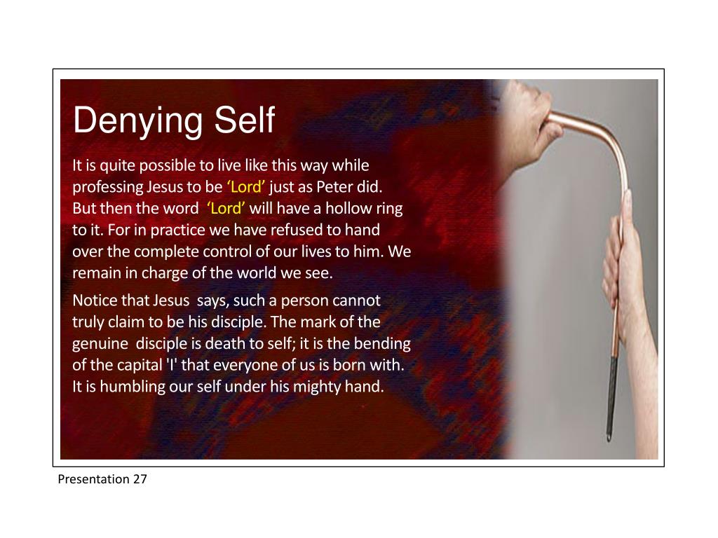 Denying Self It is quite possible to live like this way while professing Jesus to be ‘Lord’ just as Peter did. But then the word ‘Lord’ will have a hollow ring to it. For in practice we have refused to hand over the complete control of our lives to him. We remain in charge of the world we see. Notice that Jesus says, such a person cannot truly claim to be his disciple. The mark of the genuine disciple is death to self; it is the bending of the capital 'I' that everyone of us is born with. It is humbling our self under his mighty hand. Presentation 27