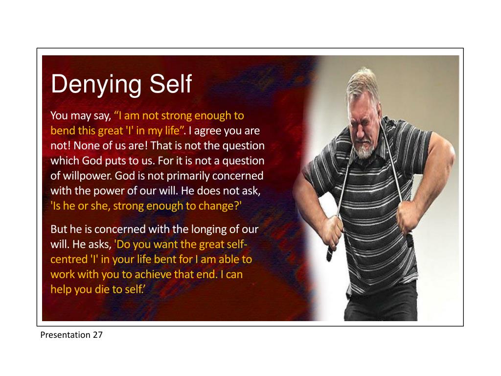 Denying Self You may say, “I am not strong enough to bend this great 'I' in my life”. I agree you are not! None of us are! That is not the question which God puts to us. For it is not a question of willpower. God is not primarily concerned with the power of our will. He does not ask, 'Is he or she, strong enough to change?' But he is concerned with the longing of our will. He asks, 'Do you want the great self-centred 'I' in your life bent for I am able to work with you to achieve that end. I can help you die to self.’ Presentation 27