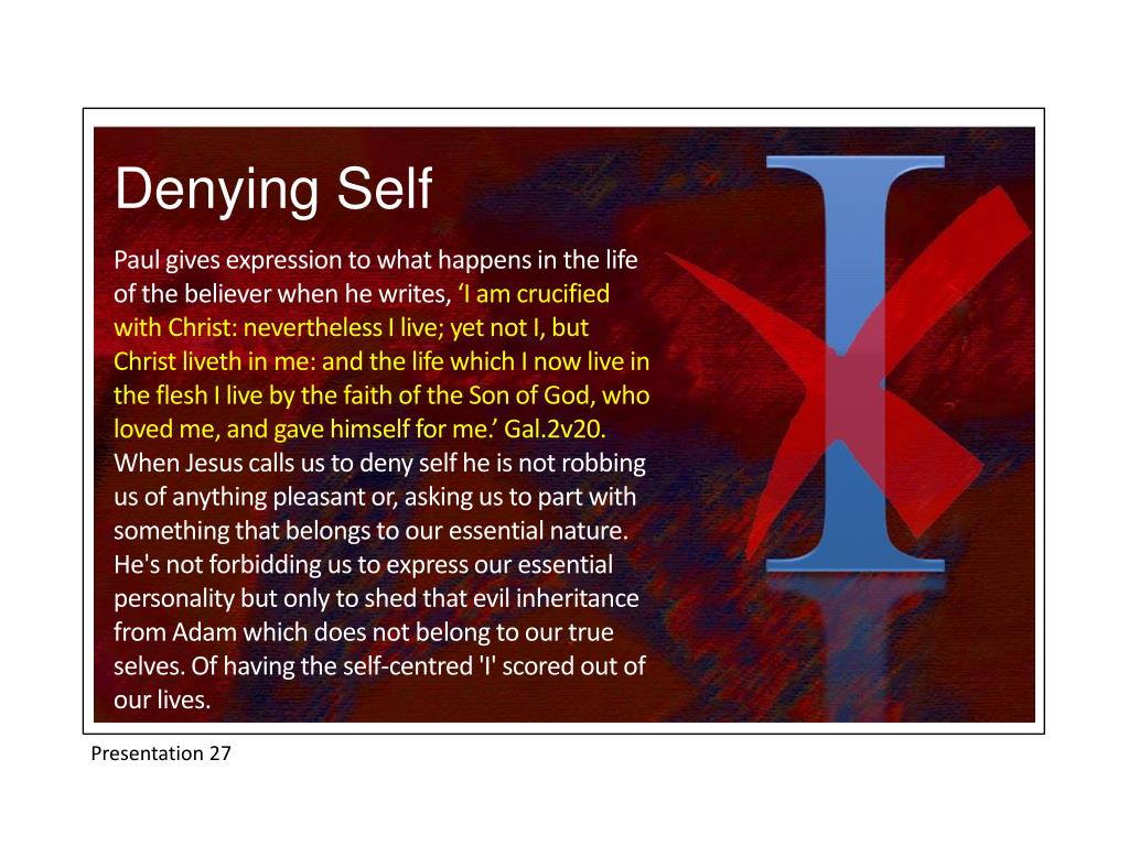 Denying Self Paul gives expression to what happens in the life of the believer when he writes, ‘I am crucified with Christ: nevertheless I live; yet not I, but Christ liveth in me: and the life which I now live in the flesh I live by the faith of the Son of God, who loved me, and gave himself for me.’ Gal.2v20. When Jesus calls us to deny self he is not robbing us of anything pleasant or, asking us to part with something that belongs to our essential nature. He's not forbidding us to express our essential personality but only to shed that evil inheritance from Adam which does not belong to our true selves. Of having the self-centred 'I' scored out of our lives. Presentation 27