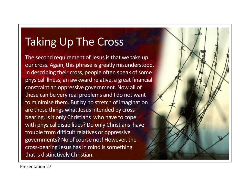 Taking Up The Cross The second requirement of Jesus is that we take up our cross. Again, this phrase is greatly misunderstood. In describing their cross, people often speak of some physical illness, an awkward relative, a great financial constraint an oppressive government. Now all of these can be very real problems and I do not want to minimise them. But by no stretch of imagination are these things what Jesus intended by cross-bearing. Is it only Christians who have to cope with physical disabilities? Do only Christians have trouble from difficult relatives or oppressive governments? No of course not! However, the cross-bearing Jesus has in mind is something that is distinctively Christian. Presentation 27