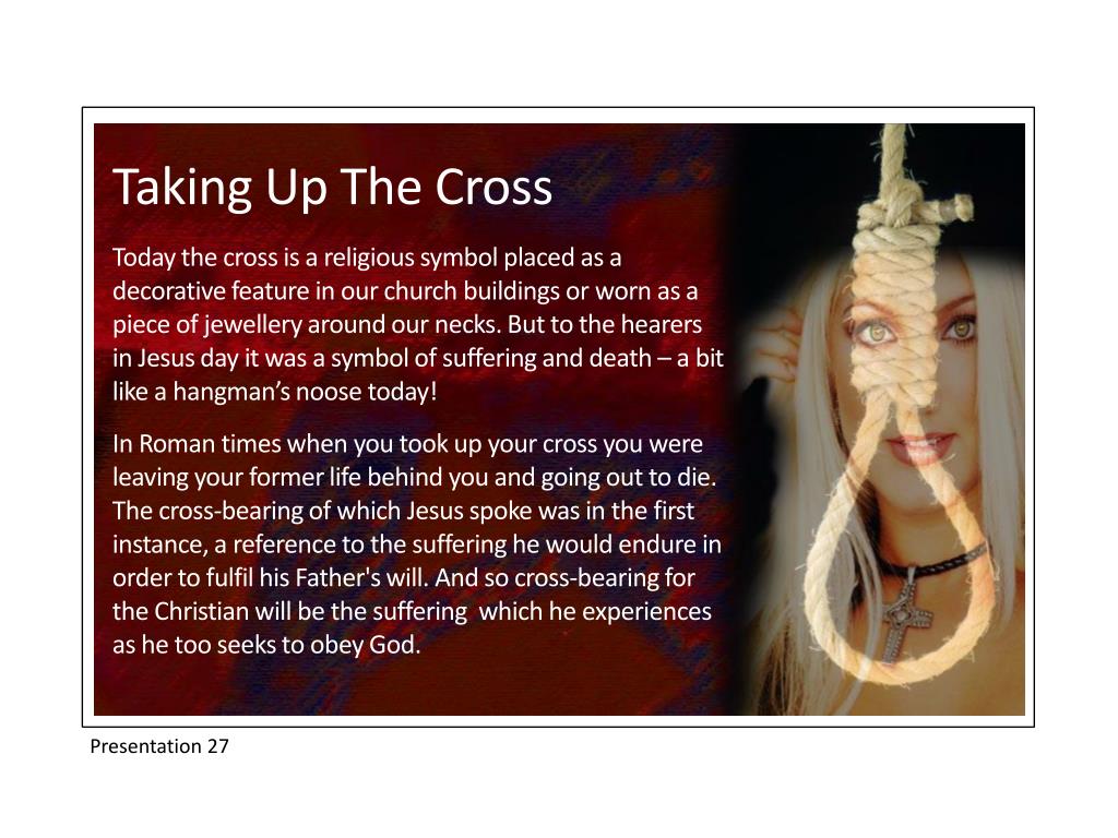 Taking Up The Cross Today the cross is a religious symbol placed as a decorative feature in our church buildings or worn as a piece of jewellery around our necks. But to the hearers in Jesus day it was a symbol of suffering and death – a bit like a hangman’s noose today! In Roman times when you took up your cross you were leaving your former life behind you and going out to die. The cross-bearing of which Jesus spoke was in the first instance, a reference to the suffering he would endure in order to fulfil his Father's will. And so cross-bearing for the Christian will be the suffering which he experiences as he too seeks to obey God. Presentation 27