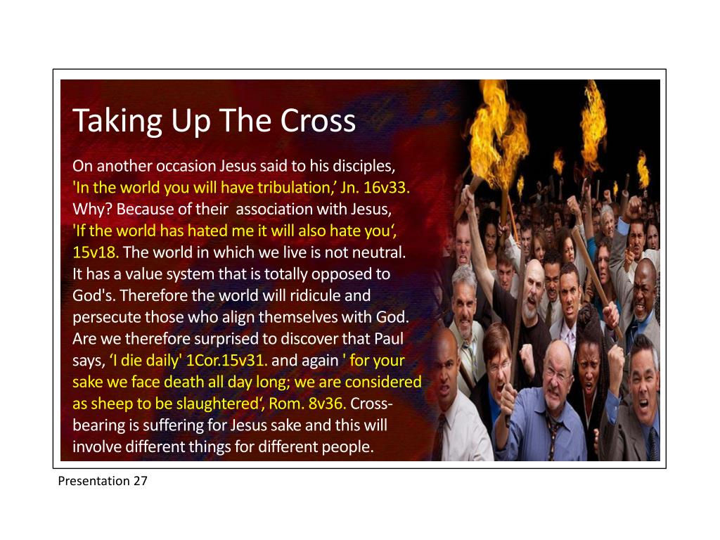 Taking Up The Cross On another occasion Jesus said to his disciples, 'In the world you will have tribulation,’ Jn. 16v33. Why? Because of their association with Jesus, 'If the world has hated me it will also hate you‘,15v18. The world in which we live is not neutral. It has a value system that is totally opposed to God's. Therefore the world will ridicule and persecute those who align themselves with God. Are we therefore surprised to discover that Paul says, ‘I die daily' 1Cor.15v31. and again ' for your sake we face death all day long; we are considered as sheep to be slaughtered‘, Rom. 8v36. Cross-bearing is suffering for Jesus sake and this will involve different things for different people. Presentation 27