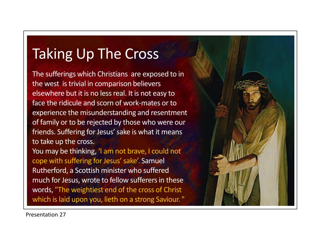 Taking Up The Cross The sufferings which Christians are exposed to in the west is trivial in comparison believers elsewhere but it is no less real. It is not easy to face the ridicule and scorn of work-mates or to experience the misunderstanding and resentment of family or to be rejected by those who were our friends. Suffering for Jesus’ sake is what it means to take up the cross. You may be thinking, ‘I am not brave, I could not cope with suffering for Jesus’ sake’. Samuel Rutherford, a Scottish minister who suffered much for Jesus, wrote to fellow sufferers in these words, "The weightiest end of the cross of Christ which is laid upon you, lieth on a strong Saviour. " Presentation 27