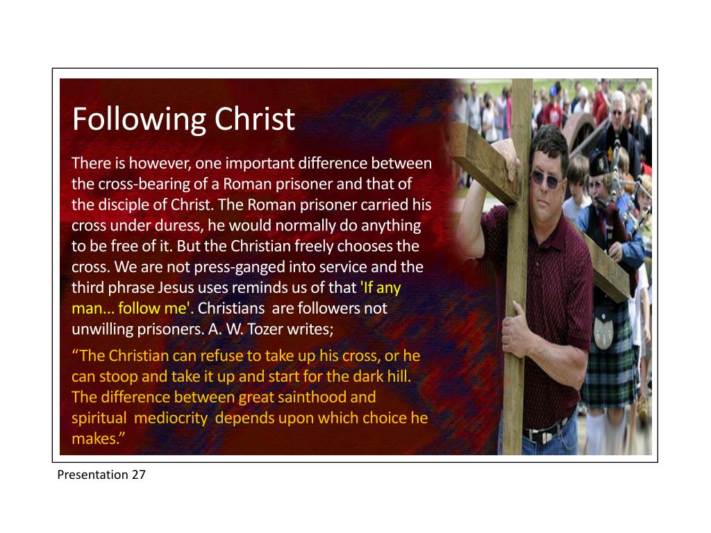 Following Christ There is however, one important difference between the cross-bearing of a Roman prisoner and that of the disciple of Christ. The Roman prisoner carried his cross under duress, he would normally do anything to be free of it. But the Christian freely chooses the cross. We are not press-ganged into service and the third phrase Jesus uses reminds us of that 'If any man... follow me'. Christians are followers not unwilling prisoners. A. W. Tozer writes; “The Christian can refuse to take up his cross, or he can stoop and take it up and start for the dark hill. The difference between great sainthood and spiritual mediocrity depends upon which choice he makes.” Presentation 27