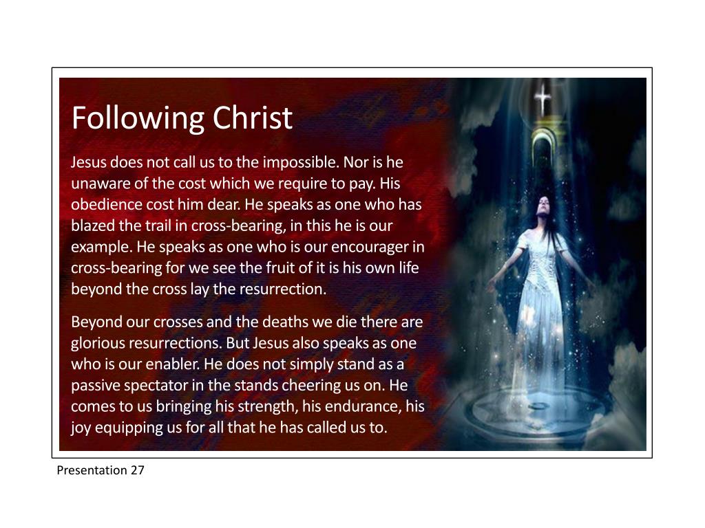 Following Christ Jesus does not call us to the impossible. Nor is he unaware of the cost which we require to pay. His obedience cost him dear. He speaks as one who has blazed the trail in cross-bearing, in this he is our example. He speaks as one who is our encourager in cross-bearing for we see the fruit of it is his own life beyond the cross lay the resurrection. Beyond our crosses and the deaths we die there are glorious resurrections. But Jesus also speaks as one who is our enabler. He does not simply stand as a passive spectator in the stands cheering us on. He comes to us bringing his strength, his endurance, his joy equipping us for all that he has called us to. Presentation 27