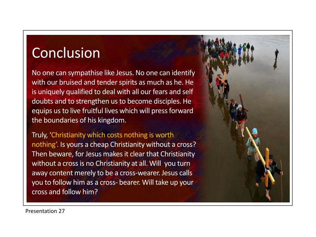 Conclusion No one can sympathise like Jesus. No one can identify with our bruised and tender spirits as much as he. He is uniquely qualified to deal with all our fears and self doubts and to strengthen us to become disciples. He equips us to live fruitful lives which will press forward the boundaries of his kingdom. Truly, ‘Christianity which costs nothing is worth nothing’. Is yours a cheap Christianity without a cross? Then beware, for Jesus makes it clear that Christianity without a cross is no Christianity at all. Will you turn away content merely to be a cross-wearer. Jesus calls you to follow him as a cross- bearer. Will take up your cross and follow him? Presentation 27
