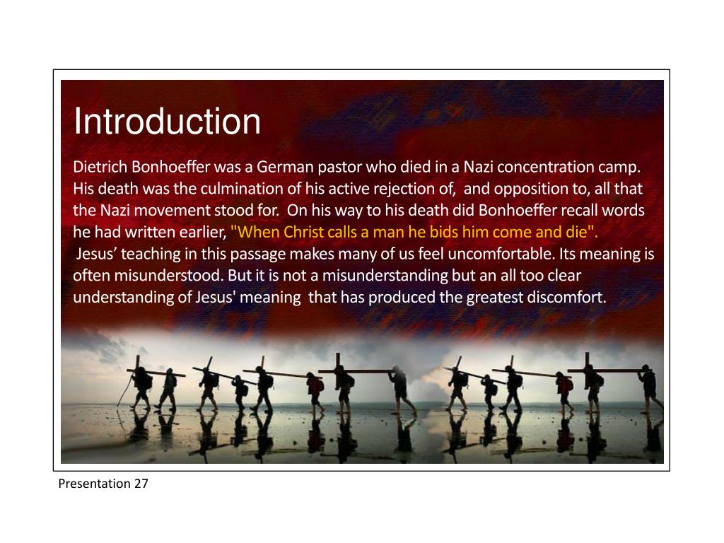 Introduction Dietrich Bonhoeffer was a German pastor who died in a Nazi concentration camp. His death was the culmination of his active rejection of, and opposition to, all that the Nazi movement stood for. On his way to his death did Bonhoeffer recall words he had written earlier, "When Christ calls a man he bids him come and die". Jesus’ teaching in this passage makes many of us feel uncomfortable. Its meaning is often misunderstood. But it is not a misunderstanding but an all too clear understanding of Jesus' meaning that has produced the greatest discomfort. Presentation 27