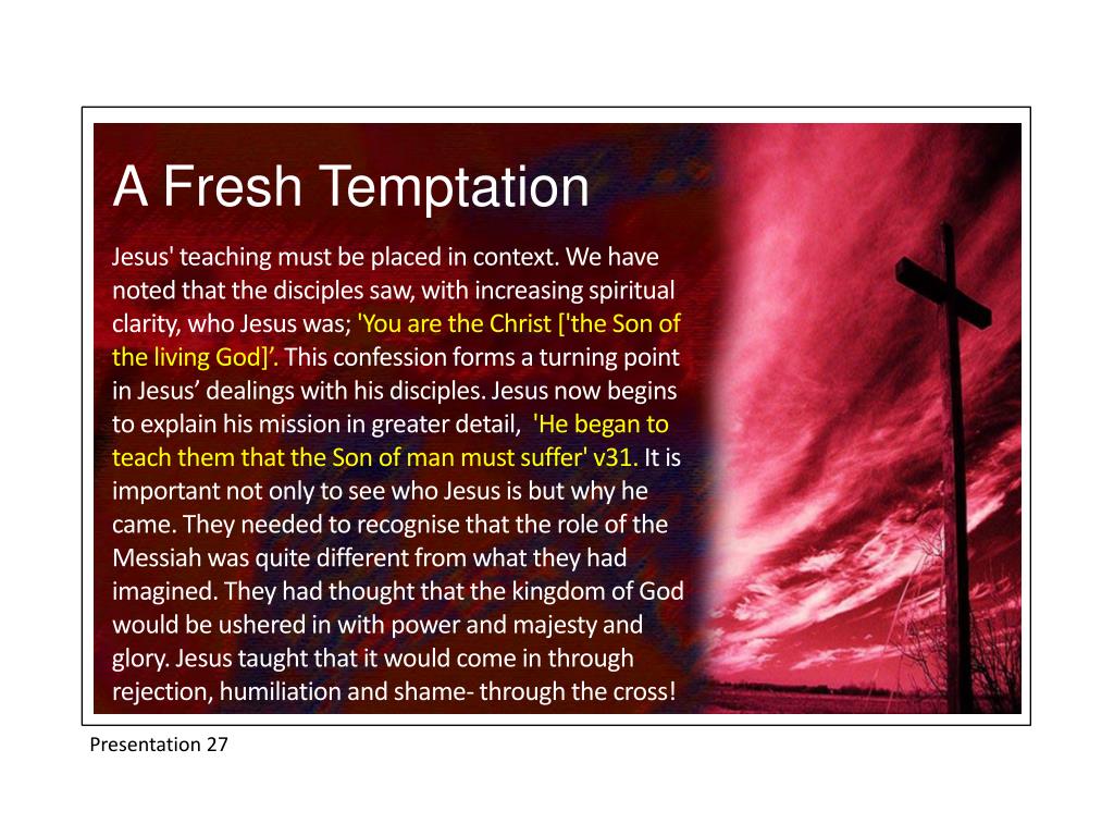 A Fresh Temptation Jesus' teaching must be placed in context. We have noted that the disciples saw, with increasing spiritual clarity, who Jesus was; 'You are the Christ ['the Son of the living God]’. This confession forms a turning point in Jesus’ dealings with his disciples. Jesus now begins to explain his mission in greater detail, 'He began to teach them that the Son of man must suffer' v31. It is important not only to see who Jesus is but why he came. They needed to recognise that the role of the Messiah was quite different from what they had imagined. They had thought that the kingdom of God would be ushered in with power and majesty and glory. Jesus taught that it would come in through rejection, humiliation and shame- through the cross! Presentation 27