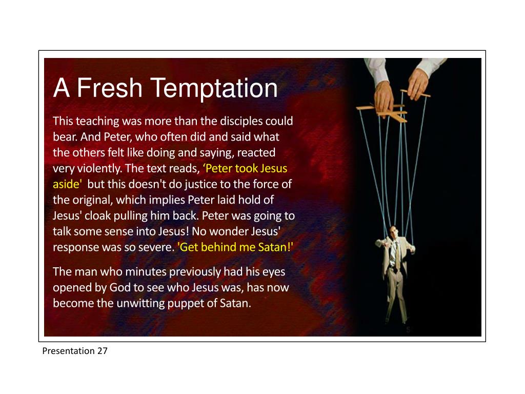 A Fresh Temptation This teaching was more than the disciples could bear. And Peter, who often did and said what the others felt like doing and saying, reacted very violently. The text reads, ‘Peter took Jesus aside' but this doesn't do justice to the force of the original, which implies Peter laid hold of Jesus' cloak pulling him back. Peter was going to talk some sense into Jesus! No wonder Jesus' response was so severe. 'Get behind me Satan!' The man who minutes previously had his eyes opened by God to see who Jesus was, has now become the unwitting puppet of Satan. Presentation 27