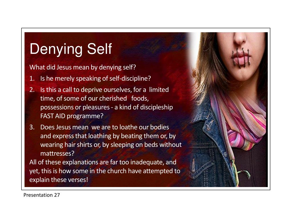 Denying Self What did Jesus mean by denying self? Is he merely speaking of self-discipline? Is this a call to deprive ourselves, for a limited time, of some of our cherished foods, possessions or pleasures - a kind of discipleship FAST AID programme? Does Jesus mean we are to loathe our bodies and express that loathing by beating them or, by wearing hair shirts or, by sleeping on beds without mattresses? All of these explanations are far too inadequate, and yet, this is how some in the church have attempted to explain these verses! Presentation 27