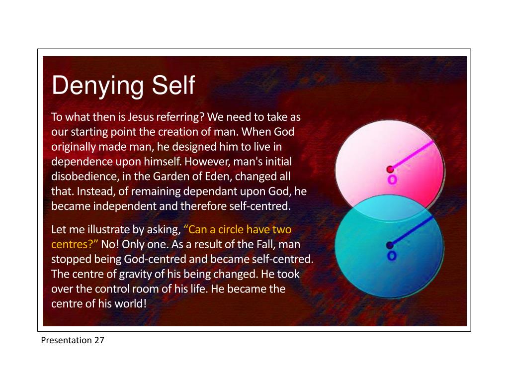Denying Self To what then is Jesus referring? We need to take as our starting point the creation of man. When God originally made man, he designed him to live in dependence upon himself. However, man's initial disobedience, in the Garden of Eden, changed all that. Instead, of remaining dependant upon God, he became independent and therefore self-centred. Let me illustrate by asking, “Can a circle have two centres?” No! Only one. As a result of the Fall, man stopped being God-centred and became self-centred. The centre of gravity of his being changed. He took over the control room of his life. He became the centre of his world! Presentation 27