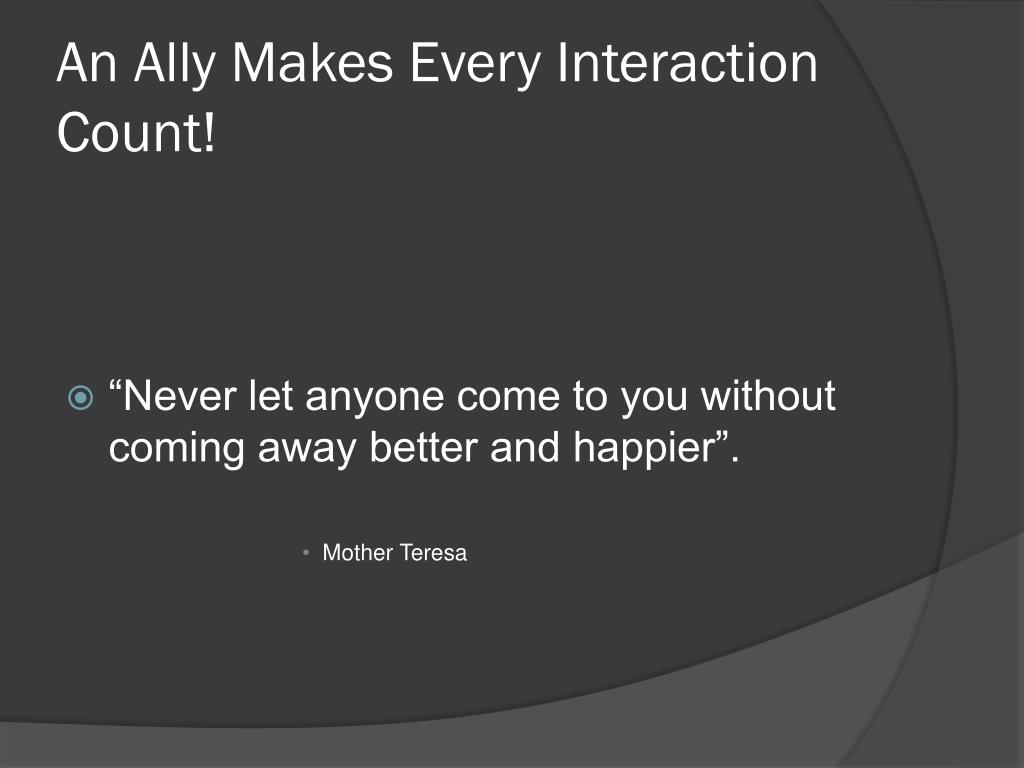 An Ally Makes Every Interaction Count! • “Never let anyone come to you without coming away better and happier”. • Mother Teresa