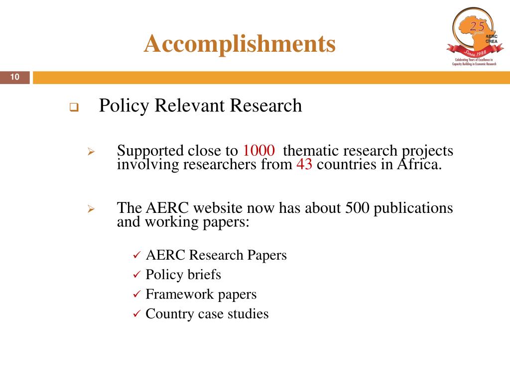 Accomplishments • Policy Relevant Research • Supported close to 1000 thematic research projects involving researchers from 43 countries in Africa. • The AERC website now has about 500 publications and working papers: • AERC Research Papers • Policy briefs • Framework papers • Country case studies
