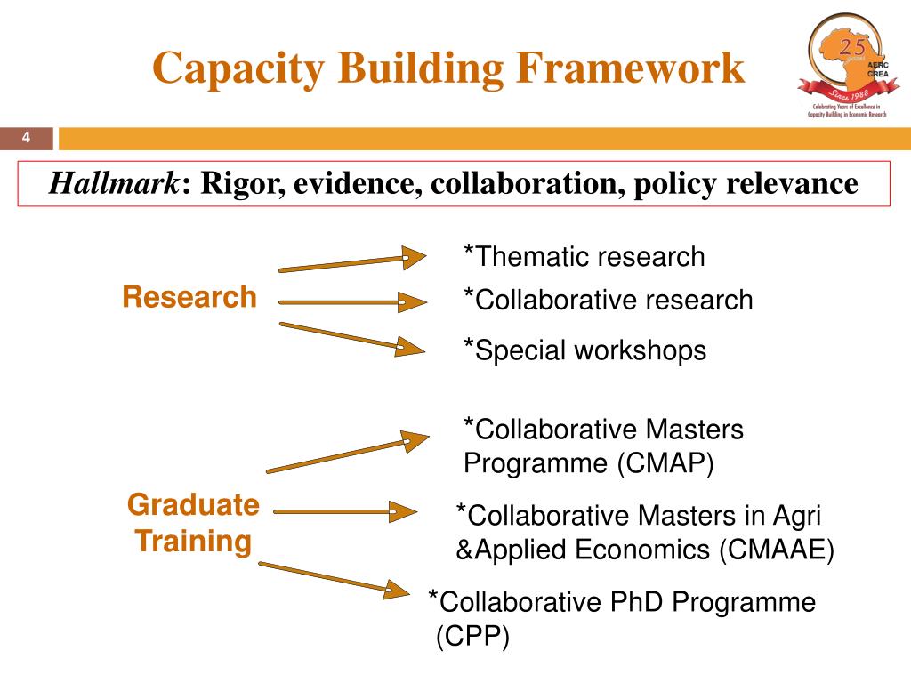 Capacity Building Framework *Thematic research Research *Collaborative research *Special workshops *Collaborative Masters Programme (CMAP) Graduate Training *Collaborative Masters in Agri &Applied Economics (CMAAE) *Collaborative PhD Programme (CPP) Hallmark: Rigor, evidence, collaboration, policy relevance