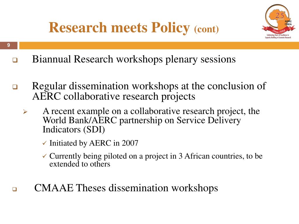Research meets Policy (cont) • Biannual Research workshops plenary sessions • Regular dissemination workshops at the conclusion of AERC collaborative research projects • A recent example on a collaborative research project, the World Bank/AERC partnership on Service Delivery Indicators (SDI) • Initiated by AERC in 2007 • Currently being piloted on a project in 3 African countries, to be extended to others • CMAAE Theses dissemination workshops
