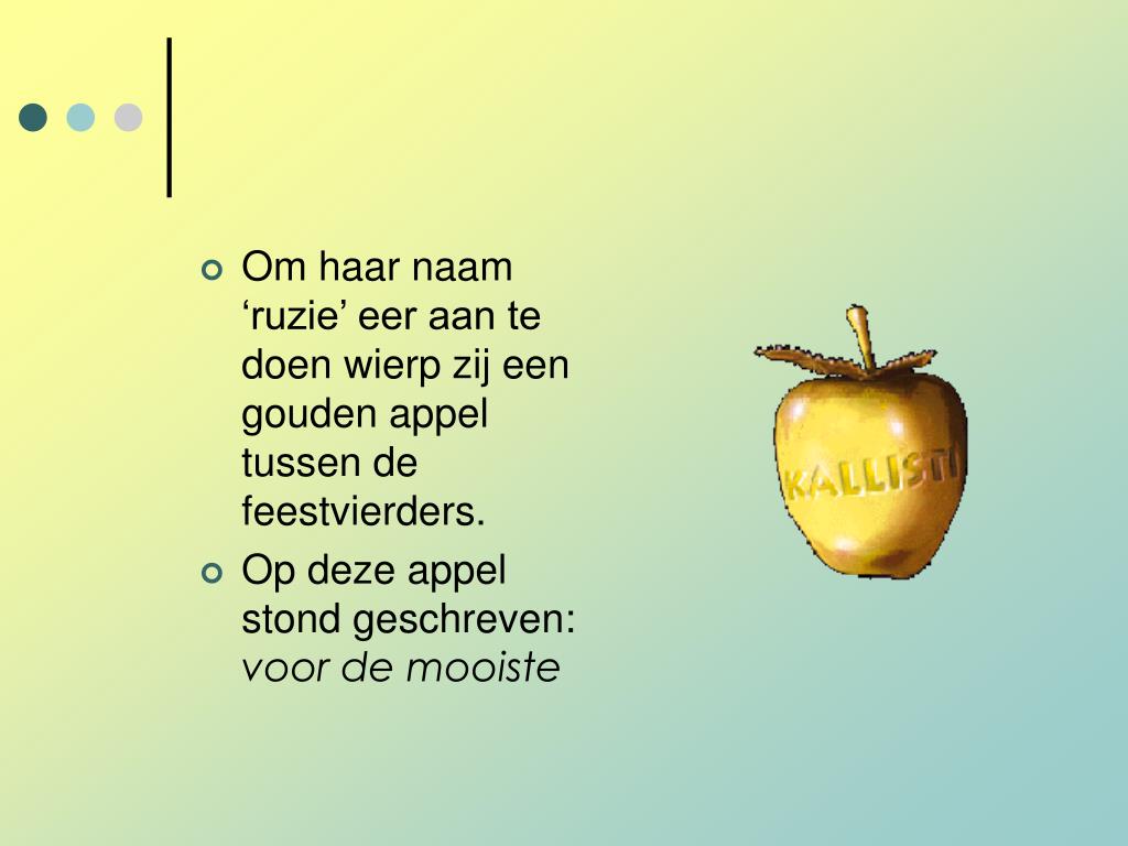 Om haar naam ‘ruzie’ eer aan te doen wierp zij een gouden appel tussen de feestvierders. • Op deze appel stond geschreven: voor de mooiste