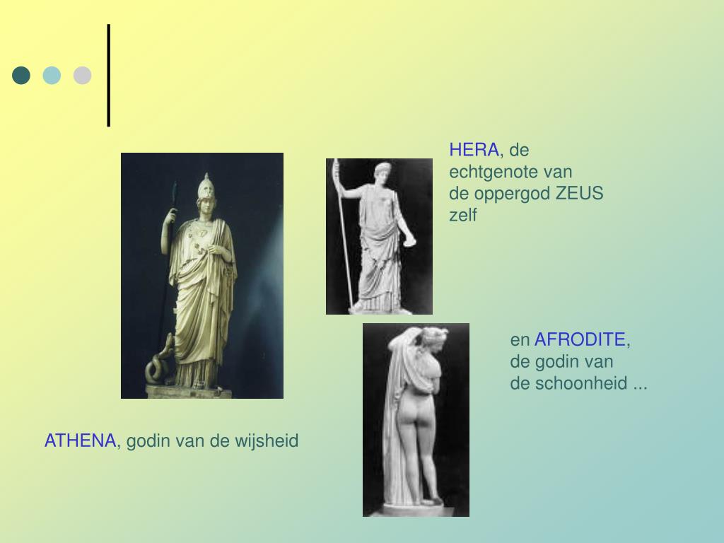 HERA, de echtgenote van de oppergod ZEUS zelf en AFRODITE, de godin van de schoonheid ... ATHENA, godin van de wijsheid