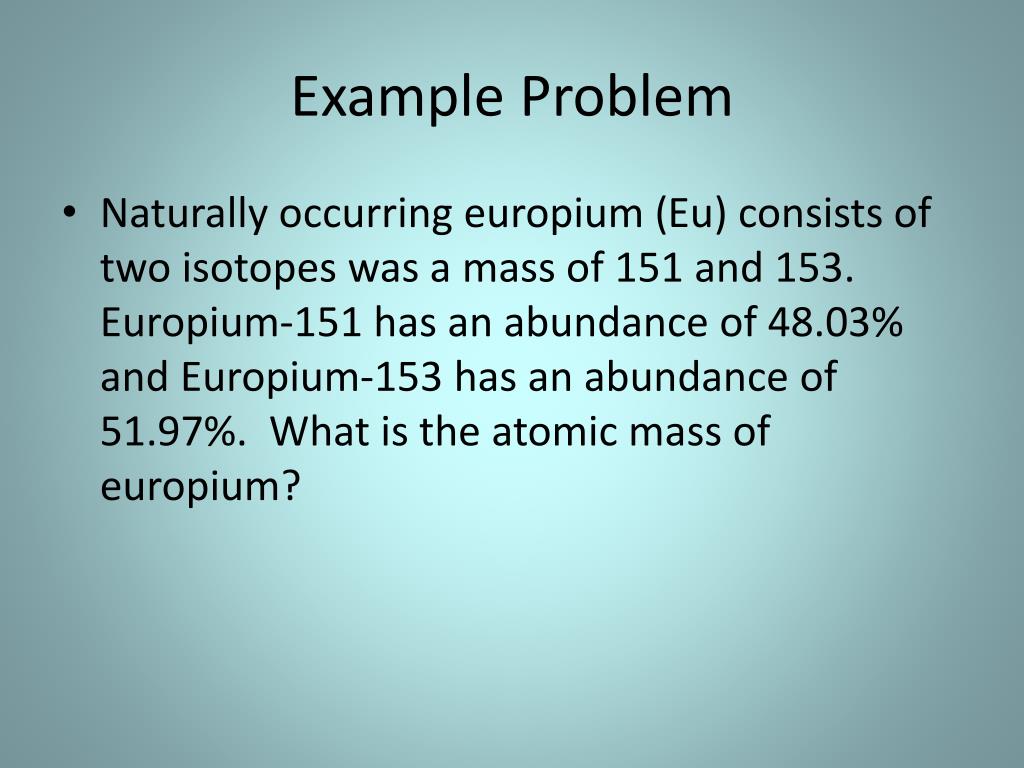 Example Problem • Naturally occurring europium (Eu) consists of two isotopes was a mass of 151 and 153. Europium-151 has an abundance of 48.03% and Europium-153 has an abundance of 51.97%. What is the atomic mass of europium?