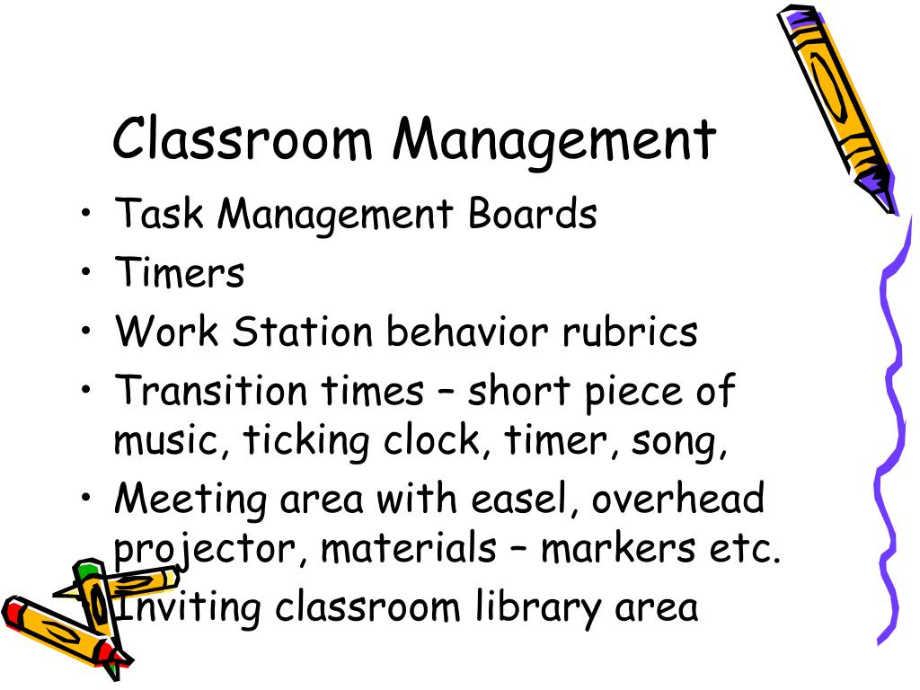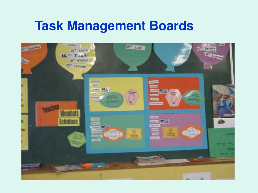 Classroom Management • Task Management Boards • Timers • Work Station behavior rubrics • Transition times – short piece of music, ticking clock, timer, song, • Meeting area with easel, overhead projector, materials – markers etc. • Inviting classroom library area