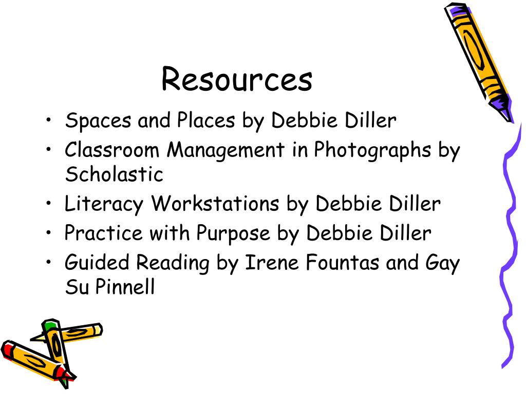 Resources • Spaces and Places by Debbie Diller • Classroom Management in Photographs by Scholastic • Literacy Workstations by Debbie Diller • Practice with Purpose by Debbie Diller • Guided Reading by Irene Fountas and Gay Su Pinnell