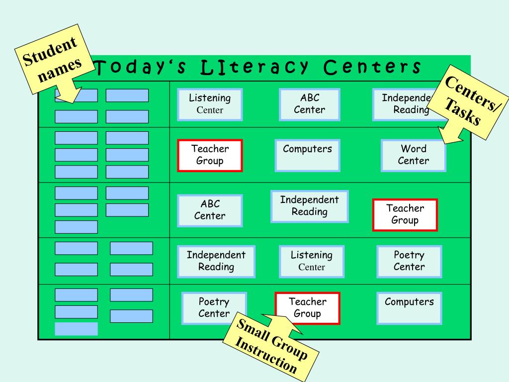Student names T o d a y ‘ s L I t e r a c y C e n t e r s Centers/ Tasks Listening Center ABC Center Independent Reading Teacher Group Computers Word Center Independent Reading ABC Center Teacher Group Independent Reading Listening Center Poetry Center Poetry Center Teacher Group Computers Small Group Instruction