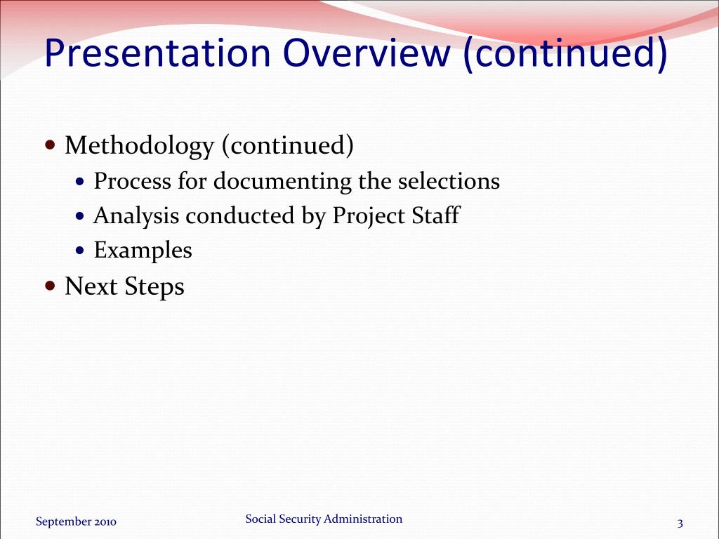 Presentation Overview (continued) • Methodology (continued) • Process for documenting the selections • Analysis conducted by Project Staff • Examples • Next Steps Social Security Administration