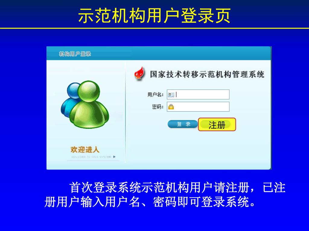 示范机构用户登录页 注册 首次登录系统示范机构用户请注册,已注册用户输入用户名、密码即可登录系统。