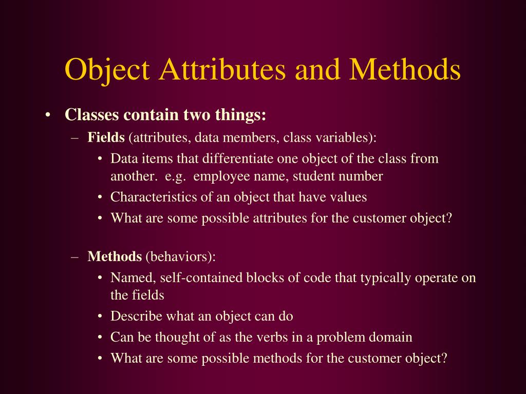 Object Attributes and Methods • Classes contain two things: • Fields (attributes, data members, class variables): • Data items that differentiate one object of the class from another. e.g. employee name, student number • Characteristics of an object that have values • What are some possible attributes for the customer object? • Methods (behaviors): • Named, self-contained blocks of code that typically operate on the fields • Describe what an object can do • Can be thought of as the verbs in a problem domain • What are some possible methods for the customer object?