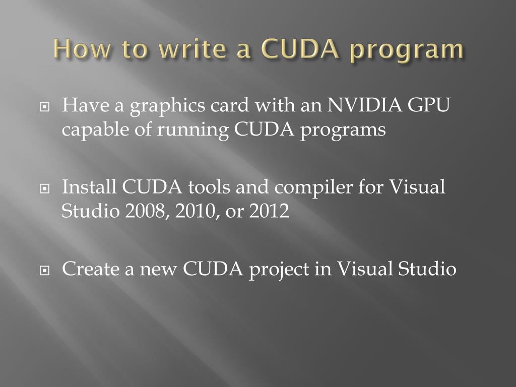 How to write a CUDA program • Have a graphics card with an NVIDIA GPU capable of running CUDA programs • Install CUDA tools and compiler for Visual Studio 2008, 2010, or 2012 • Create a new CUDA project in Visual Studio