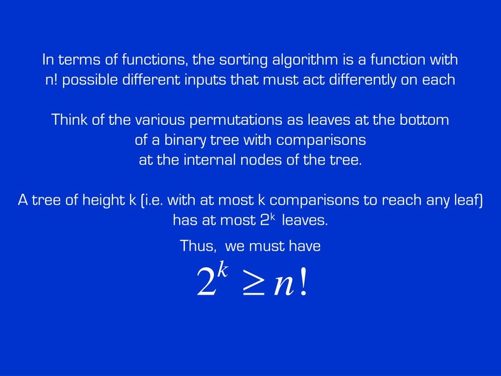 In terms of functions, the sorting algorithm is a function with n! possible different inputs that must act differently on each Think of the various permutations as leaves at the bottom of a binary tree with comparisons at the internal nodes of the tree. A tree of height k (i.e. with at most k comparisons to reach any leaf) has at most 2k leaves. Thus, we must have