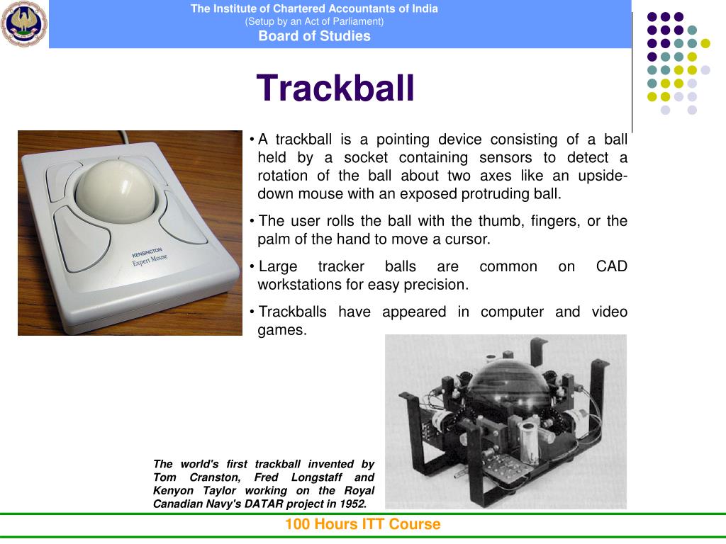 Trackball • A trackball is a pointing device consisting of a ball held by a socket containing sensors to detect a rotation of the ball about two axes like an upside- down mouse with an exposed protruding ball. • The user rolls the ball with the thumb, fingers, or the palm of the hand to move a cursor. • Large tracker balls are common on CAD workstations for easy precision. • Trackballs have appeared in computer and video games. The world's first trackball invented by Tom Cranston, Fred Longstaff and Kenyon Taylor working on the Royal Canadian Navy's DATAR project in 1952.