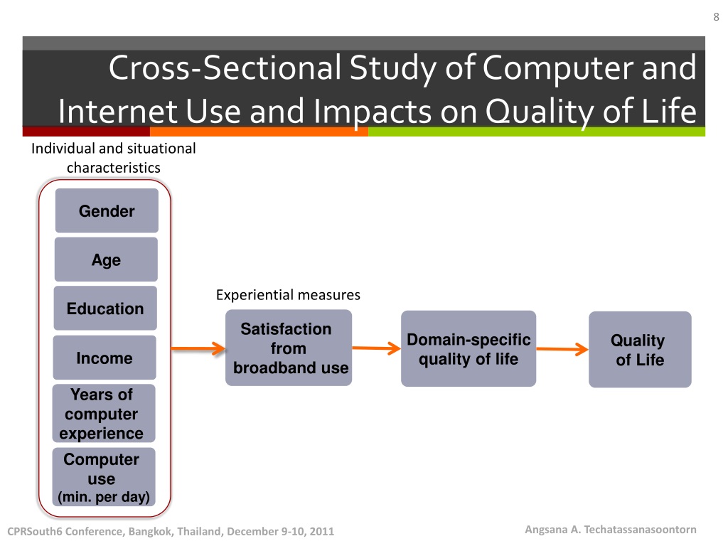 Cross-Sectional Study of Computer and Internet Use and Impacts on Quality of Life Individual and situationalcharacteristics Gender Age Experiential measures Education Satisfaction from broadband use Domain-specificquality of life Quality of Life Income Years of computer experience Computer use (min. per day) Angsana A. Techatassanasoontorn