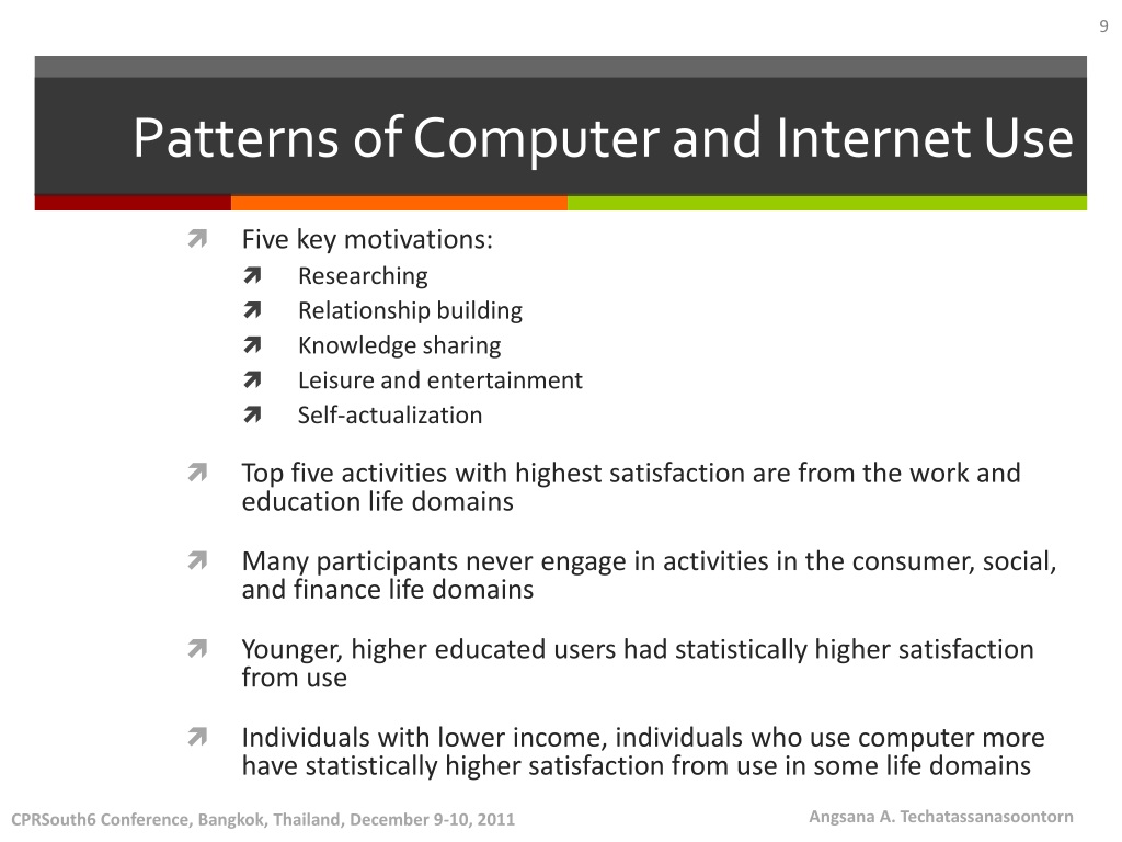 Patterns of Computer and Internet Use • Five key motivations: • Researching • Relationship building • Knowledge sharing • Leisure and entertainment • Self-actualization • Top five activities with highest satisfaction are from the work and education life domains • Many participants never engage in activities in the consumer, social, and finance life domains • Younger, higher educated users had statistically higher satisfaction from use • Individuals with lower income, individuals who use computer more have statistically higher satisfaction from use in some life domains Angsana A. Techatassanasoontorn