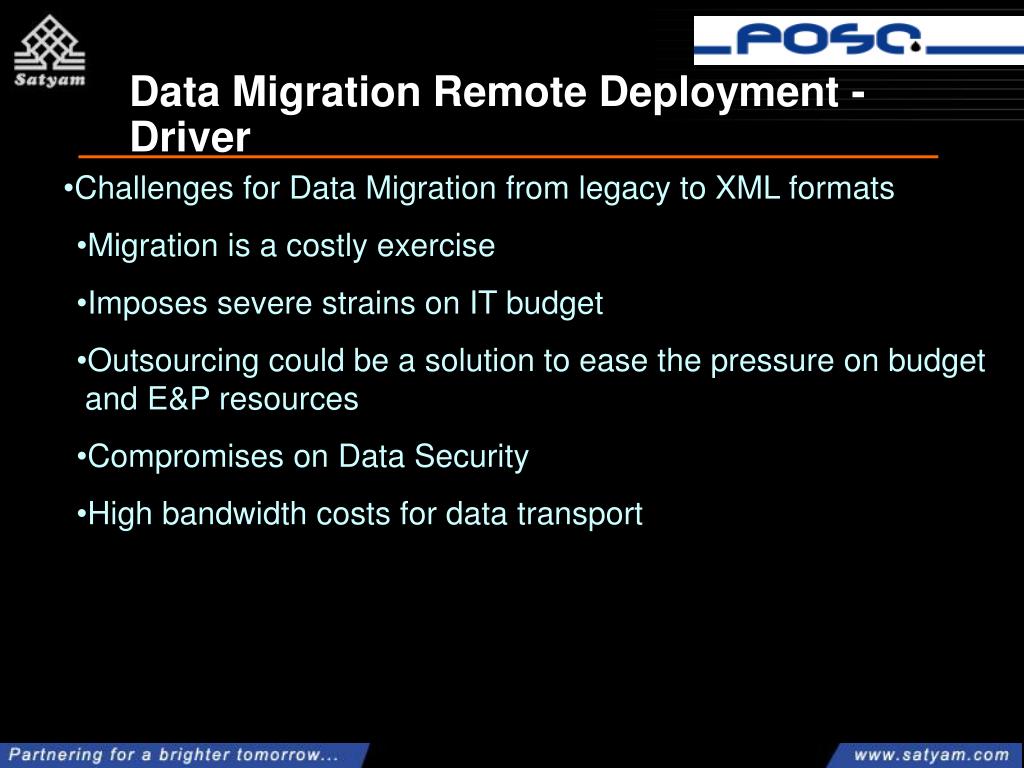 Remote Deployment of E&P Data Migration tools. Sundar K, Praveen Hubli Satyam Computers. Data Migration Remote Deployment - Driver. Challenges for Data Migration from legacy to XML formats Migration is a costly exercise Imposes severe strains on IT budget