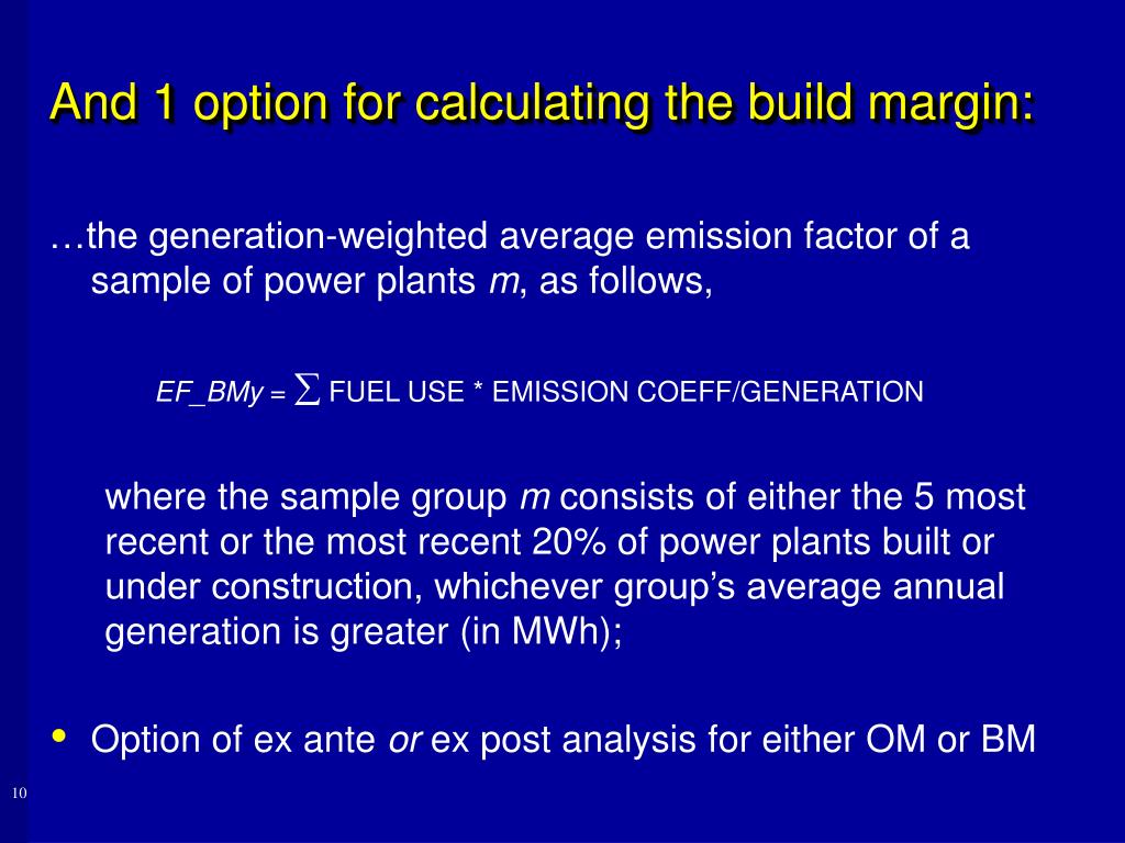 And 1 option for calculating the build margin: …the generation-weighted average emission factor of a sample of power plants m, as follows, EF_BMy = FUEL USE * EMISSION COEFF/GENERATION where the sample group m consists of either the 5 most recent or the most recent 20% of power plants built or under construction, whichever group’s average annual generation is greater (in MWh); • Option of ex ante or ex post analysis for either OM or BM