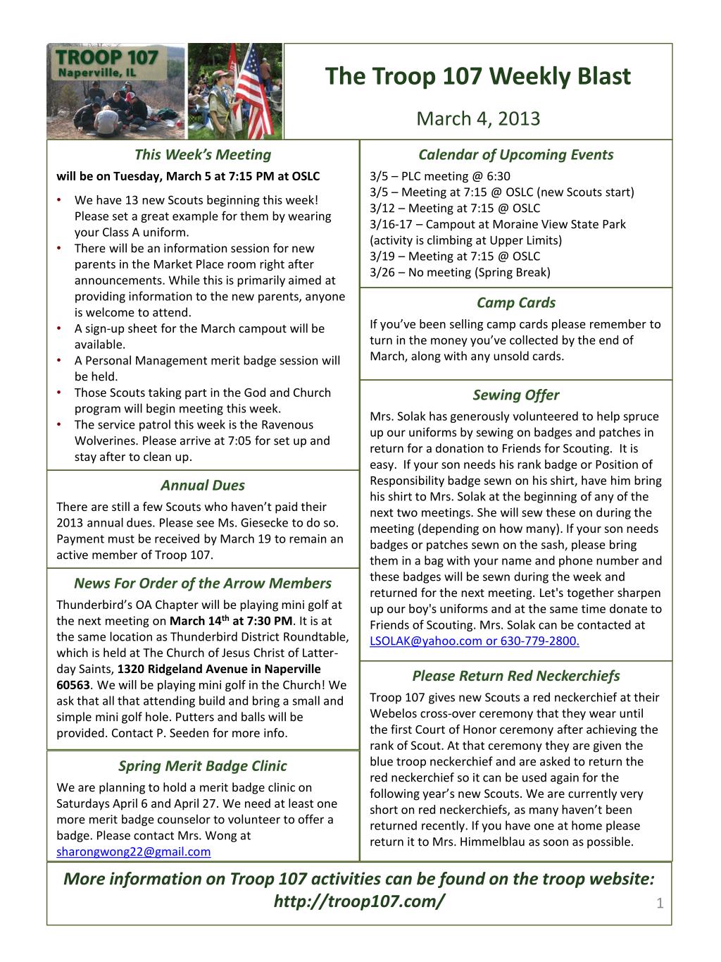The Troop 107 Weekly Blast March 4, 2013. Calendar of Upcoming Events 3/5 – PLC meeting @ 6:30 3/5 – Meeting at 7:15 @ OSLC (new Scouts start) 3 /12 – Meeting at 7:15 @ OSLC 3 /16-17 – Campout at Moraine View State Park (activity is climbing at Upper Limits)